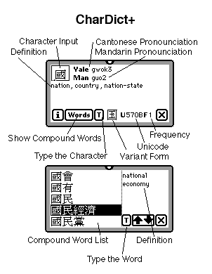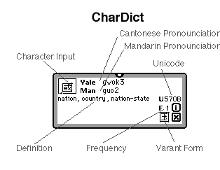 CharDict and CharDict+ are dictionaries of definitions, pronounciations, variants, and frequency for four thousand basic Chinese characters. It's important to note that in Chinese, characters are not always words. CharDict only contains characters; but CharDict+ also contains 2600 or 14,000 common compound Chinese words and definitions, depending on the dictionary option. I chiefly wrote CharDict to make it easy for me to look up single characters which I had forgotten. CharDict and CharDict+ have only been tested on the Newton MessagePad 2000.