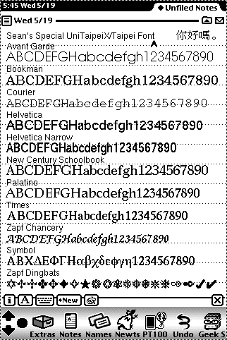 UniTaipeiX is a popular Chinese font for the Newton. However, standard versions of this font have a special installation script which replaces the Newton system fonts so Chinese can be displayed in buttons, menus, etc. But this breaks some applications. My version of the font does not have this installation script -- it's just an ordinary Newton font just like any other. Perfect for learning Chinese.