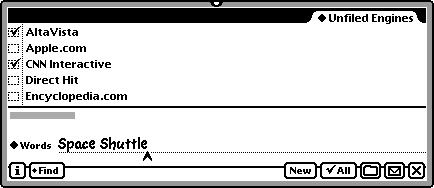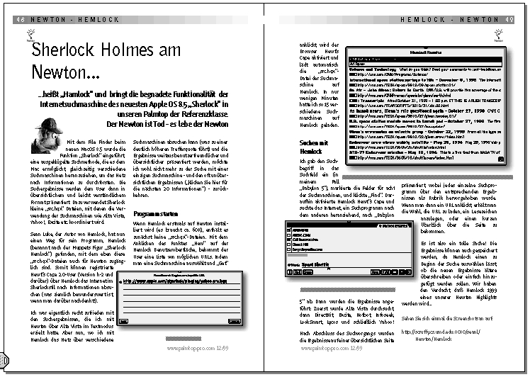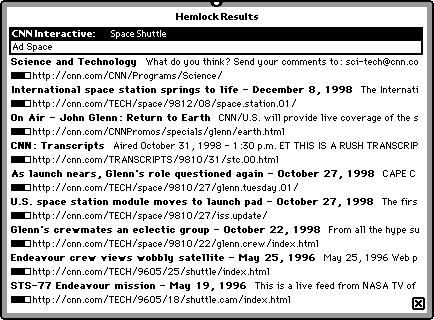 Hemlock searches multiple internet search engines, news organizations, shopping centers, even top-ten lists using for user-specified search terms, putting the results in a scrollable list similar to the results in the Newton's Find panel. To search the web, Hemlock uses Apple Computer's Sherlock™ plugins. Hemlock is free.