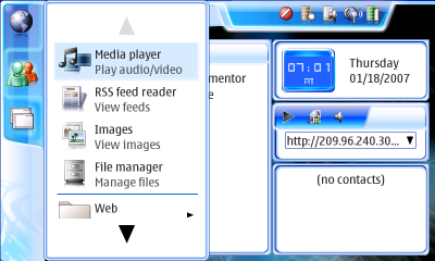 Note the considerable amount of wasted whitespace, which only emphasizes the icons' small size. A number of the icons throughout applications are also light in color on a big white background, making them quite surprisingly hard to read on the N800 screen. Making matters worse, there's a useless decorative border on the bottom of the button bar which does nothing when tapped. If Nokia had seen fit to change the background, make the icons larger (there's plenty of space!), move them closer together, and delete the borders so as to increase the vertical hit-space, we'd have a much easier to use toolbar. How can we know this? Because there's another bar on the same screen which employs Nokia's "slightly bigger" icons on a legible background: the Status Bar! Shown below.