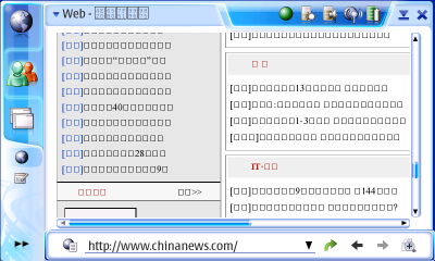 Out-of-the-Box Unicode Support GTK+ supports Unicode. But how could the N800 have not come with a Unicode font built-in from the start to display in the web browser, much less a Unicode entry system built-in? At right is what we get in Opera when we visit ChinaNews.com. In contrast, the Newton was the first device (PDA or computer) to use Unicode as its foundation, and its web browsers could even display Chinese characters. Like the N800, the Newton didn't come with, say, Chinese fonts by default (come on, this was 1995). But Chinese fonts for the Newton were easily found by even rank beginners and loaded without any difficulty; and they worked everywhere instantly. At right is a screenshot of some fonts I ported to the Newton, including a slight tweak to a preexisting Chinese font. All could be printed to Postscript printers.