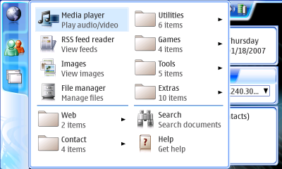 The N800 has a nice feature. If you press on the screen with your finger, certain menus and keyboards pop up in "big" size, easy to select with your finger rather than with the stylus.Unfortunately this feature is marred by a really stupid menu mechanism. Consider the "big-size" menu at right, which popped up when I pressed my finger on one of the icons at its left. What's wrong with it? Several things.