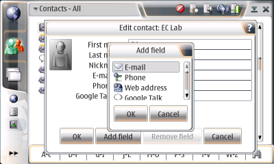 The N800 uses very few pop-ups or other time-saving widgets. For example, to add a field to a contact, I must first click on a weird ">>" button and choose "Edit... ". Then I must click on "Add field", choose a field, and press "OK", then "OK" again. All told six button taps and two dialog boxes when I could have done this with a single pop-up menu.