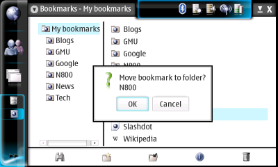 Useless confirmation dialog boxes show up a lot. Here's one from the Bookmarks application. I have just dragged my Reddit bookmark into the N800 folder (for purposes of demonstration here). And I receive: a confirmation box to move the Reddit bookmark into the N800 folder! Isn't that what I just did? On every other operating system I can think of, when you perform a drag-and-drop, it happens -- but the N800 requires you to do an extra tap to confirm what you just did.