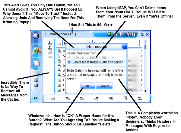 The question remains: why does this window even exist? Because unlike practically every other email program on the planet, when you delete a message on the N800, it is deleted. Not moved to a Trash folder. Gone from the server forever. If the app instead moved to Trash, this window wouldn't even be necessary, as the action would be undoable.