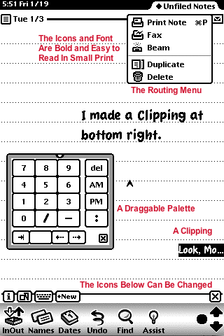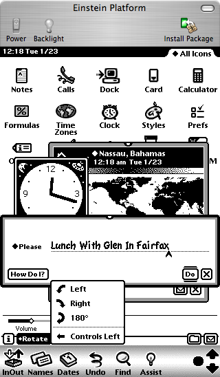Screen Rotation I find it unbelievable that in 2007 a PDA has come out which cannot rotate its screen. The Newton did this in 1995, and any orientation you liked; you could also move about the button bar (see the first Einstein picture in this article). The Palm Pilot can do it, for heavens' sakes. At right, as a quick cut-and-paste hack, I rearranged the elements in the screenshot at top to show how screen rotation might look.
