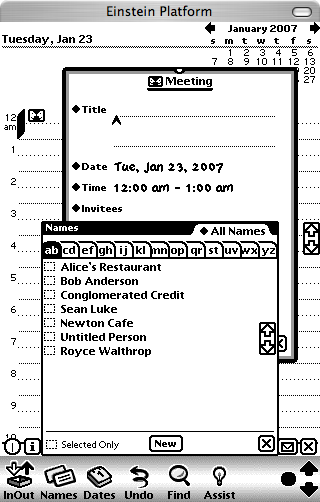 At right is a screenshot from Einstein, the bit-for-bit Newton emulator on my Mac. The UI is less flashy than Hildon of course, but anyone who's used Newtons for a while will understand that it's a very sophisticated UI. And there are a lot of things Nokia could trivially steal from it. I've hilighted in red some simple items I'll discuss below.