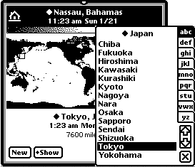 There are sophisticated pop-ups for choosing locations as well. Here I'm picking a new home location for my time zone. Tokyo looks nice. You can also click directly on the map and a menu will pop up of all the cities in the vicinity. |