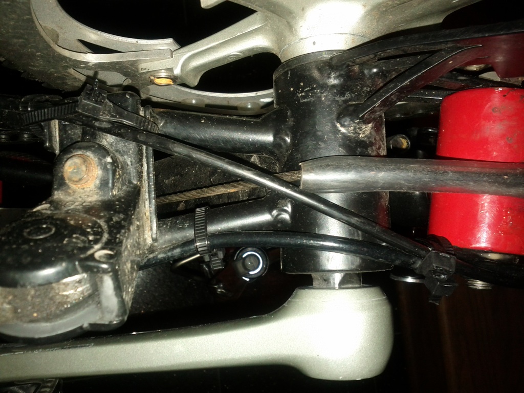 - Reroute the cables so that the hyperfold cable is between the derailleur cable and the bottom bracket. The figure at right shows one plausible routing: note the wire ties to hold the derailleur and brake at certain locations (the derailleur cable is the diagonal cable in the picture).