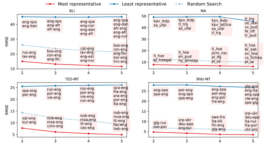 Using a beam-search like approach over the already published experimental results, we find the most representative (as well as the least representative!) dataset subsets. Unsurprisingly, the least representative ones include only typologically similar languages e.g. in machine translation into English on TED data (TED-MT in the figure) Spanish, French, Portuguese, Italian, and Arabic makes up the worst subset of 5 source languages for predicting the BLEU scores on all others. (They are all high-resource language pairs too, which further exarcebates the issue).