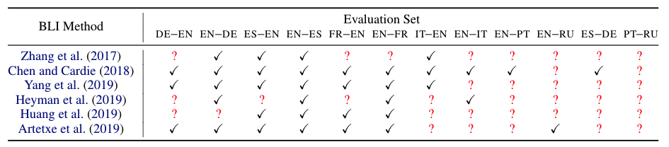 In the BLI task, the least representative language pairs are actually the ones that were most typically used by academic works for reporting results before the larger and more multilingual collection of MUSE dictionaries was available!