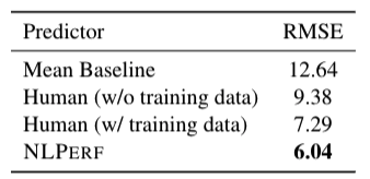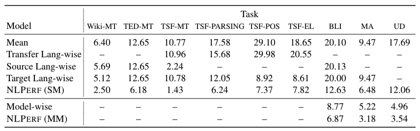 We evaluated our approach on 9 NLP tasks (including machine translation, parsing, tagging, lexicon induction). Our model (NLPERF) consistently outperforms naïve baselines such using the mean performance across all experiments, or across the same source/target/transfer language, or across the same model as the baseline’s predictions (the table shows the root mean square error of the predictions, so lower is better).