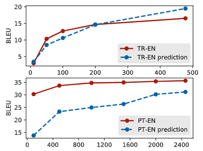 Having access to such a NLP experiment performance predictor leads to several cool applications.Feature Extrapolation: The first is the straightforward one: you can use it to get a performance estimation for datasets with various data sizes. We show examples in the following figure: we can do a very good job in predicting Turkish-English translation BLEU scores under different data conditions. The predictions are less accurate in Portuguese-English, though (although, the very high BLEU scores in Portuguese-English are a bit of an outlier compared to other-languages-to-English translation in low-resource settings).