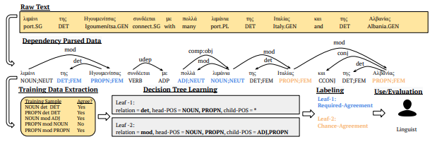 Creating a descriptive grammar of a language is an indispensable step for language documentation and preservation. However, at the same time it is a tedious, time-consuming task. In this paper, we take steps towards automating this process by devising an automated framework for extracting a first-pass grammatical specification from raw text in a concise, human- and machine-readable format. We focus on extracting rules describing agreement, a morphosyntactic phenomenon at the core of the grammars of many of the world’s languages. We apply our framework to all languages included in the Universal Dependencies project, with promising results. Using cross-lingual transfer, even with no expert annotations in the language of interest, our framework extracts a grammatical specification which is nearly equivalent to those created with large amounts of gold-standard annotated data. We confirm this finding with human expert evaluations of the rules that our framework produces, which have an average accuracy of 78%. We release an interface demonstrating the extracted rules.