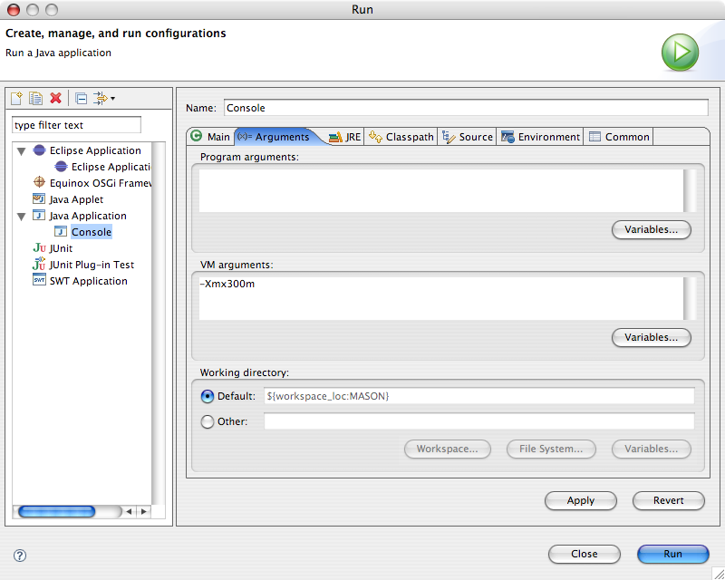 This gives MASON 300 megabytes of heap space (rather than the more typical 40 megabytes or so) when you fire it up via Console's "new-application" window. It makes the 3D MASON applications a bit more happy. Here's the window: