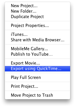 - At this point you can add titles and cross-fades and other gizmos. But we're going to just export directly from here. Right-click on the project ("MASON") and the following pop-up menu appears. Select "Export Using Quicktime...".