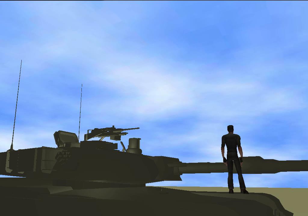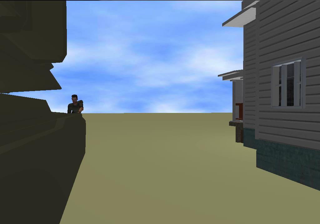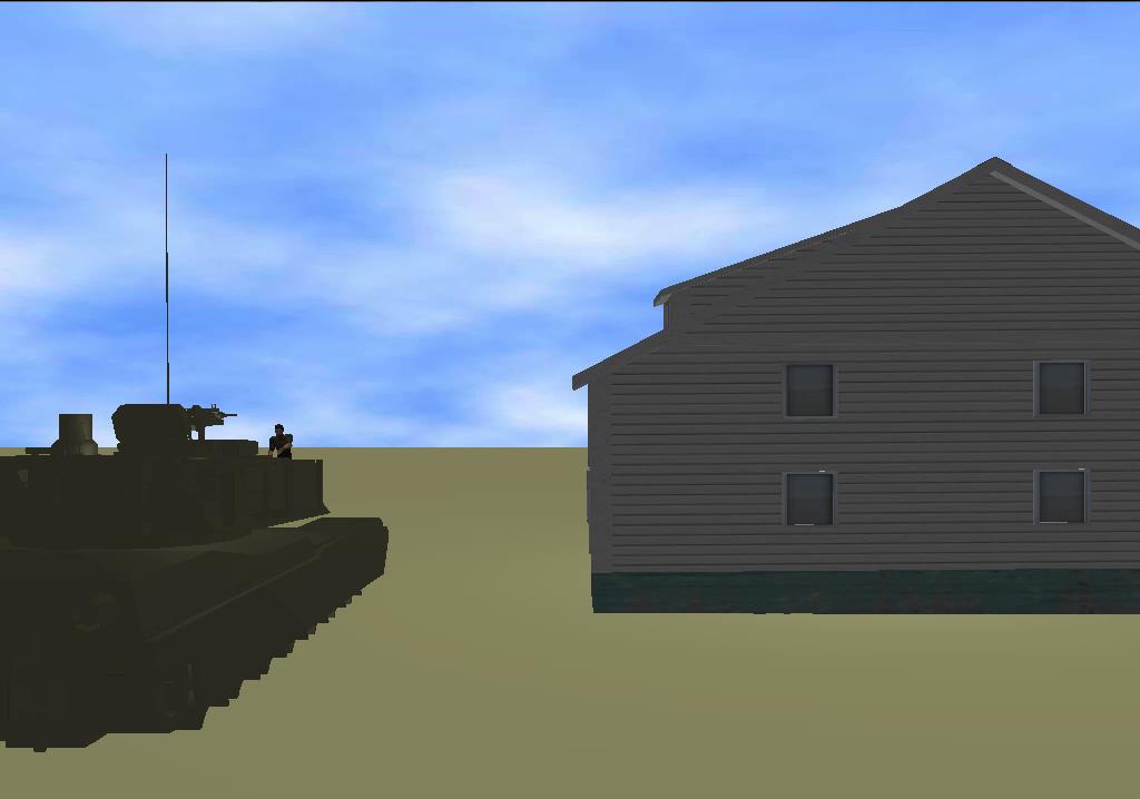 Scene created automatically from Natural Language input. Platoon and targets are represented by humanoids. The obseravation post is represented by a tall cylinder. The slag pile is represented by a pile of sandbags. |