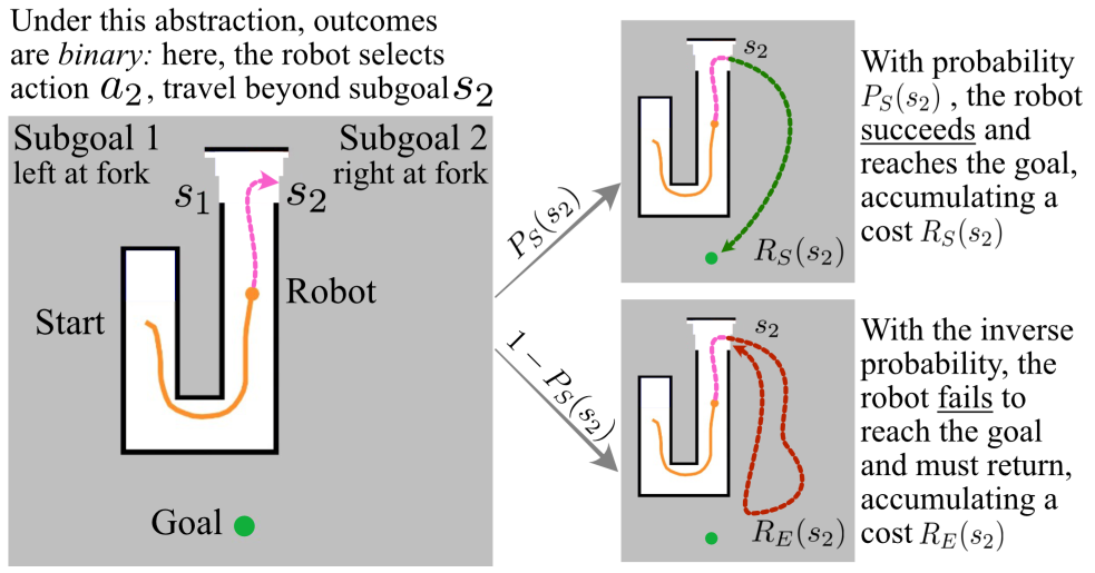 1 Use the reliable-by-design model-based LSP planning abstraction2 Create a graph representation for non-local information and use a graph neural network (GNN) for learning to inform good behaviorLSP uses high-level action abstraction to navigate long-horizon efficiently under uncertainty. This model-based planning abstraction alleviates the computational requirements of POMDP planning. For LSP planning, actions available to the robot have binary outcomes of either reaching the goal and incurring a success cost or failing and accumulating exploration cost.