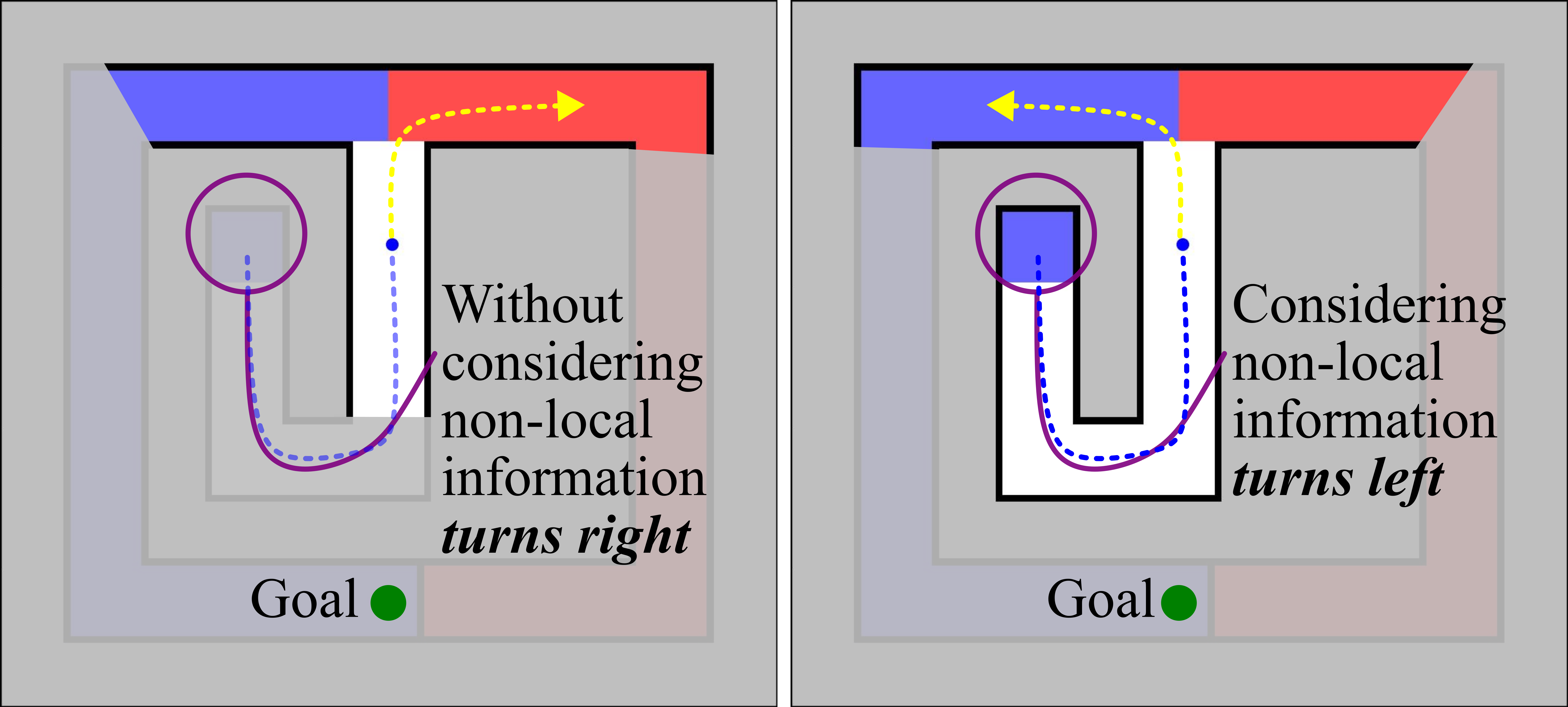 We focus on the task of goal-directed navigation in a partially-mapped environment, in which a robot is expected to reach an unseen goal in minimum expected time. To perform well, a robot must understand how parts of the environment the robot cannot currently see (i.e., non-locally available information) to inform where it should go next, a challenging problem for many existing planning strategies that rely on learning. For example, consider the following: