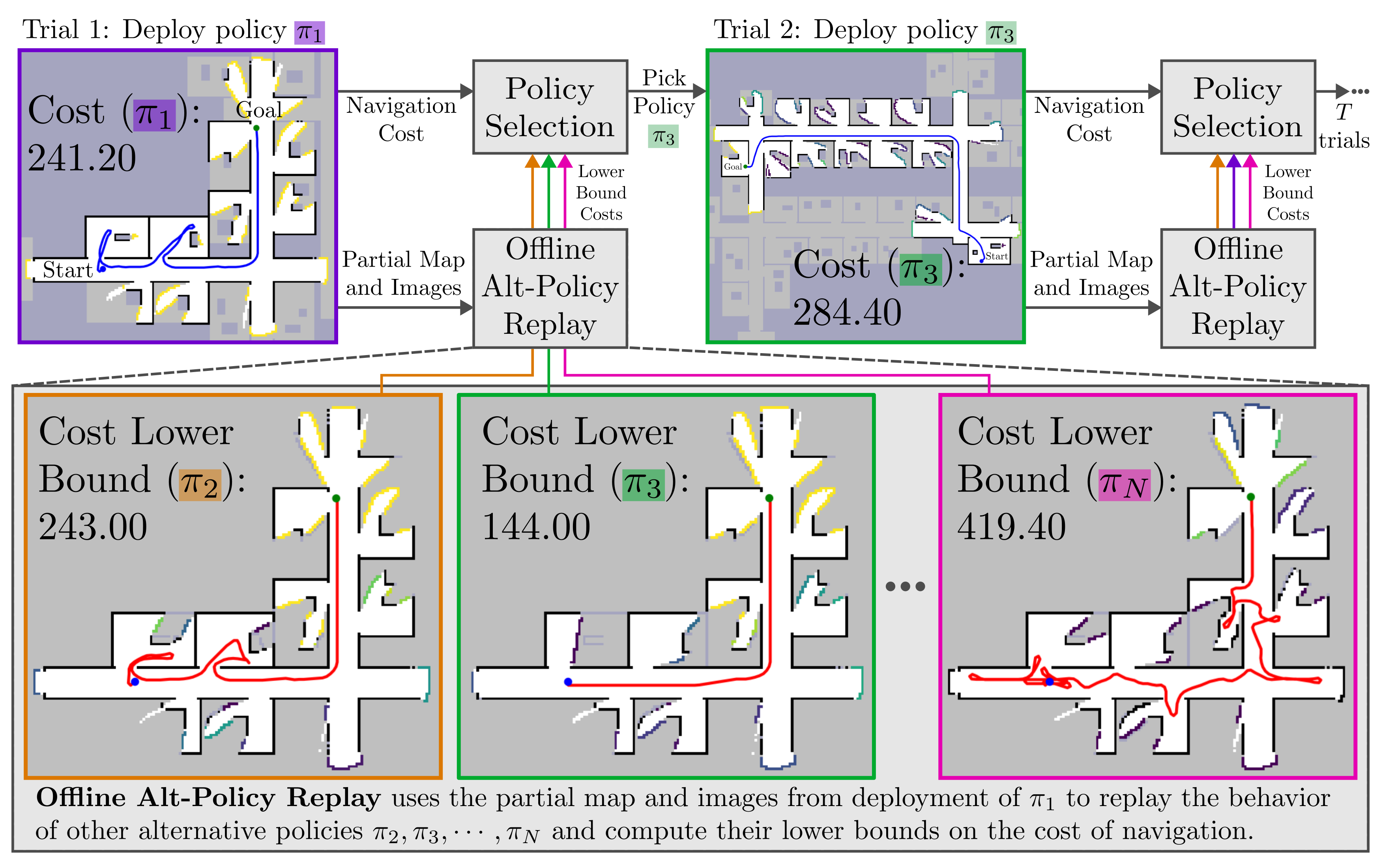 After the trial is complete, our offline alt-policy replay approach uses the partial map and images collected during the trial to compute lower bounds on the performance of other alternative policies without deploying.