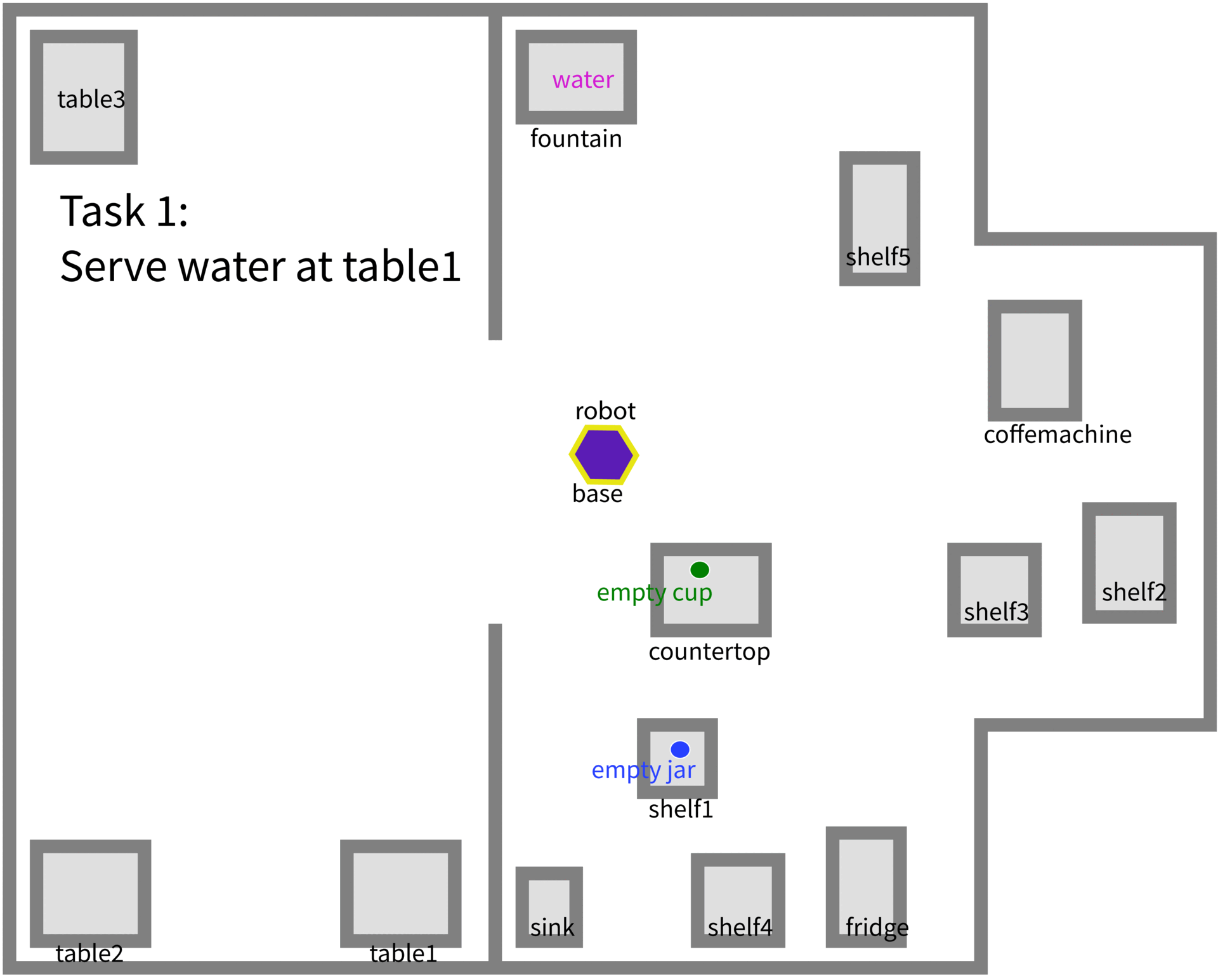As our robot minimizes both the immediate plan cost and the future expected cost so while completing the current task of serving water at Table 1, it anticipates the possible future need to serve another cup of water at a nearby location. Thus, it decides to fill a jar with water that can hold multiple cups of water and keep it on Table 1, so that when it is asked to serve water again, it can do so at a lower cost.