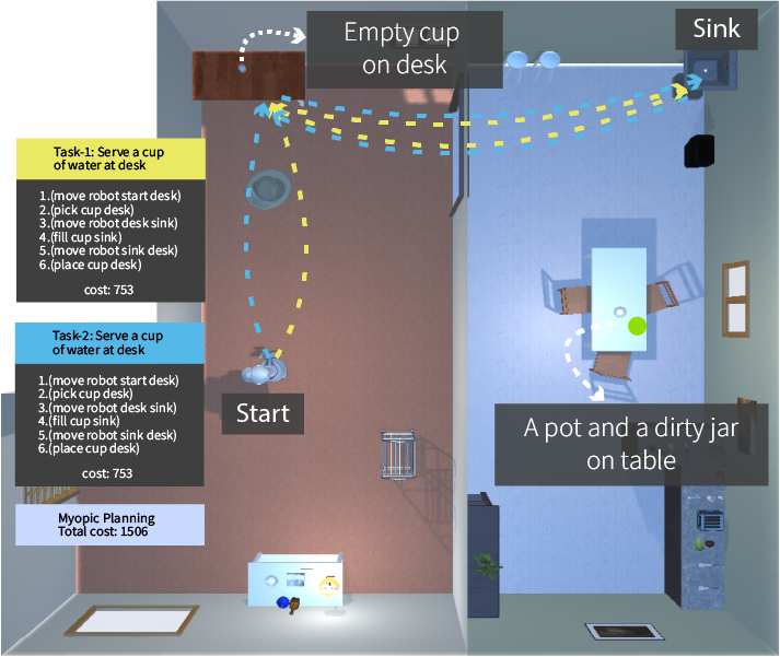 Consider this example: the robot is asked to serve water at a desk. If it behaves myopically—focusing only on the current task—it might pick up an empty cup from the desk, fill it with water at the sink, and return it to the desk. This solution is reasonable, as it efficiently completes the immediate task. If the user drinks the water and then asks for more, the robot must then repeat the same sequence of operations to pick up the cup, go all the way back to the sink, fill it up, and then return. Over time, this short-sighted approach of only caring about the current task and ignoring the future tasks can lead to higher cumulative effort or cost.