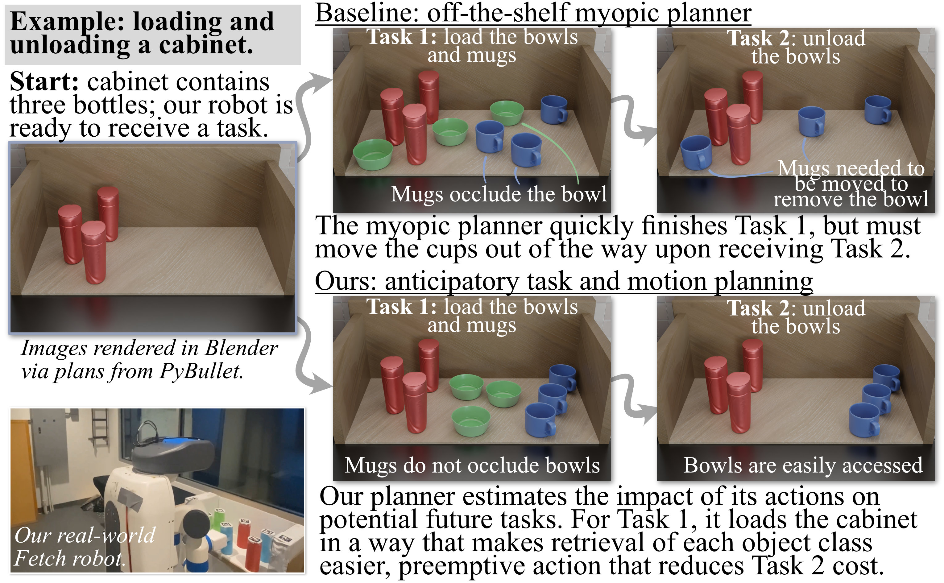 Instead, our anticipatory planning approach uses learning to estimate the expected future cost associated with a particular solution strategy, information we can use to find plans that both quickly complete the current objective and also preemptively pay down cost on possible future tasks. Experiments of ours have shown that our approach results in many forward-thinking behaviors difficult to achieve otherwise—organization, tidiness, preparation, and more—exciting opportunities for improving robots that will serve as long-lived assistive companions.