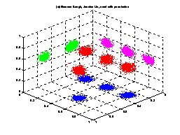 Snapshot of how clouds of points (shown in red) appear to form different numbers of clusters when projected onto different planes (shown in green, pink, and blue).