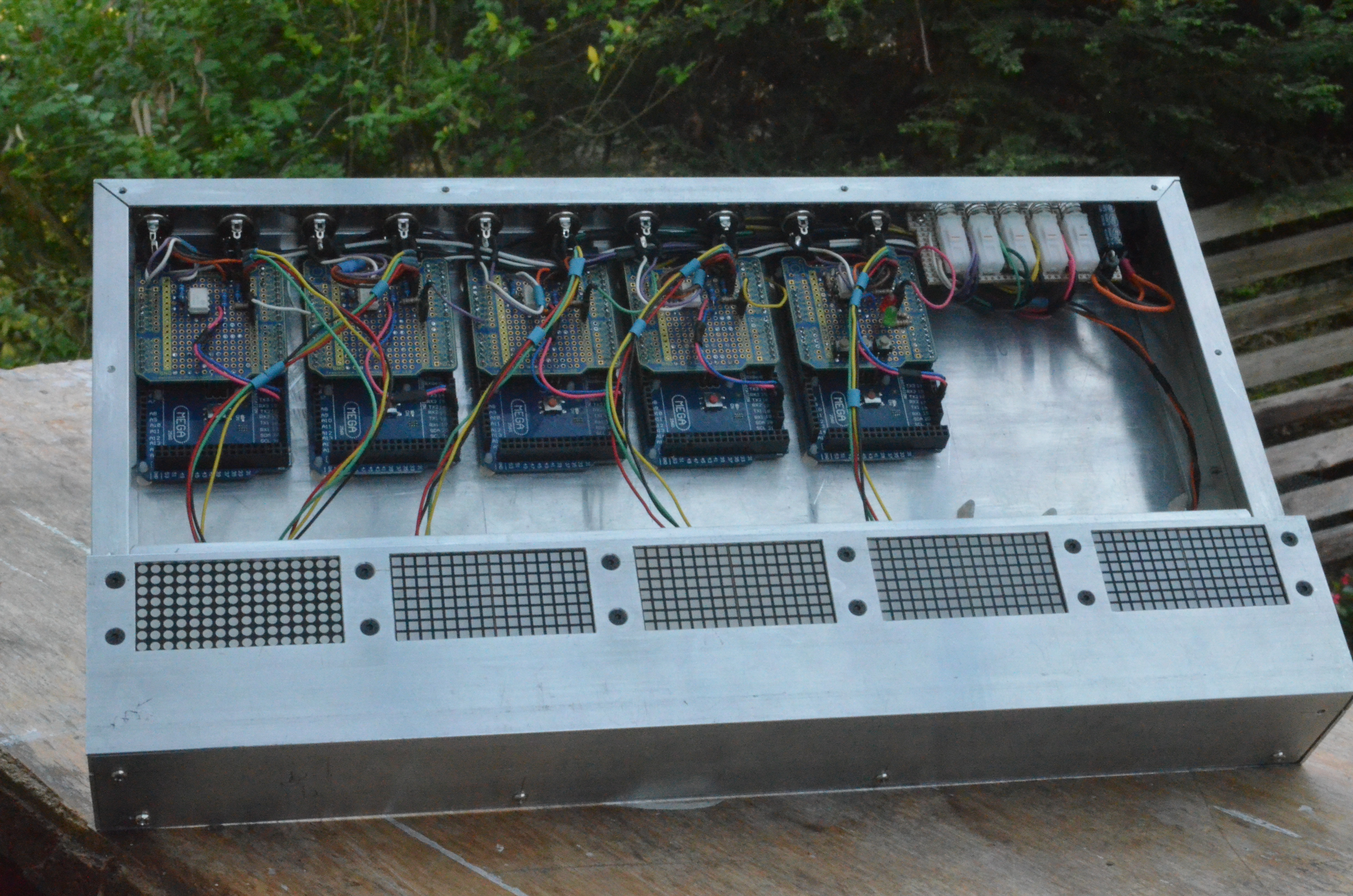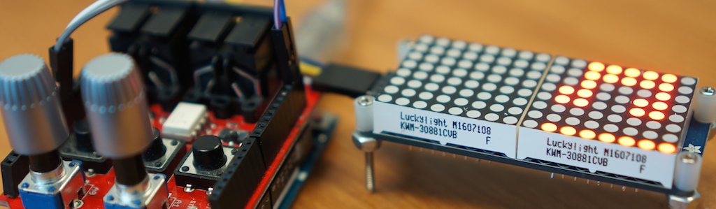 To assemble Gizmo, you just need an Arduino Uno or Mega (if you want to develop, or have all of Gizmo available at one time, definitely get a Mega), a SparkFun MIDI Shield, an Adafruit 16x8 LED Matrix Backpack (they come in various colors, shapes, and sizes -- I use 1.2" round amber red; red, light green, and orange seem to make the least noise), and some wire. And you'll do a bit of soldering.
